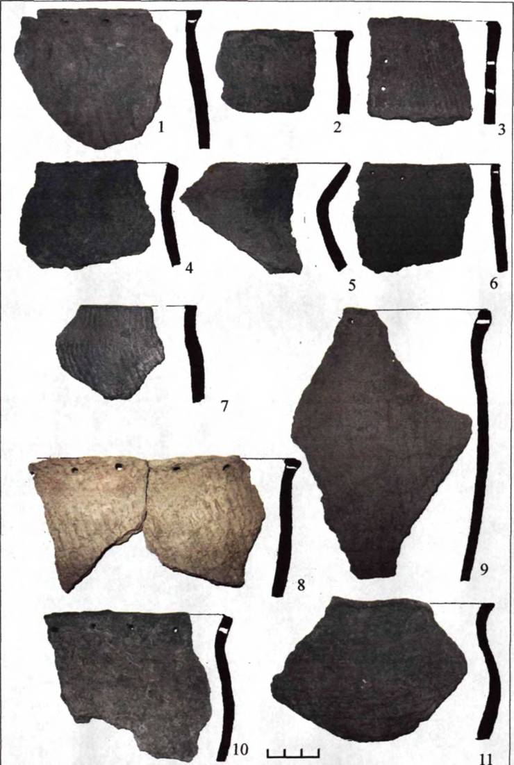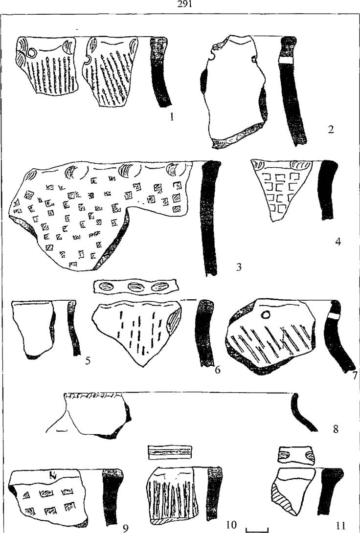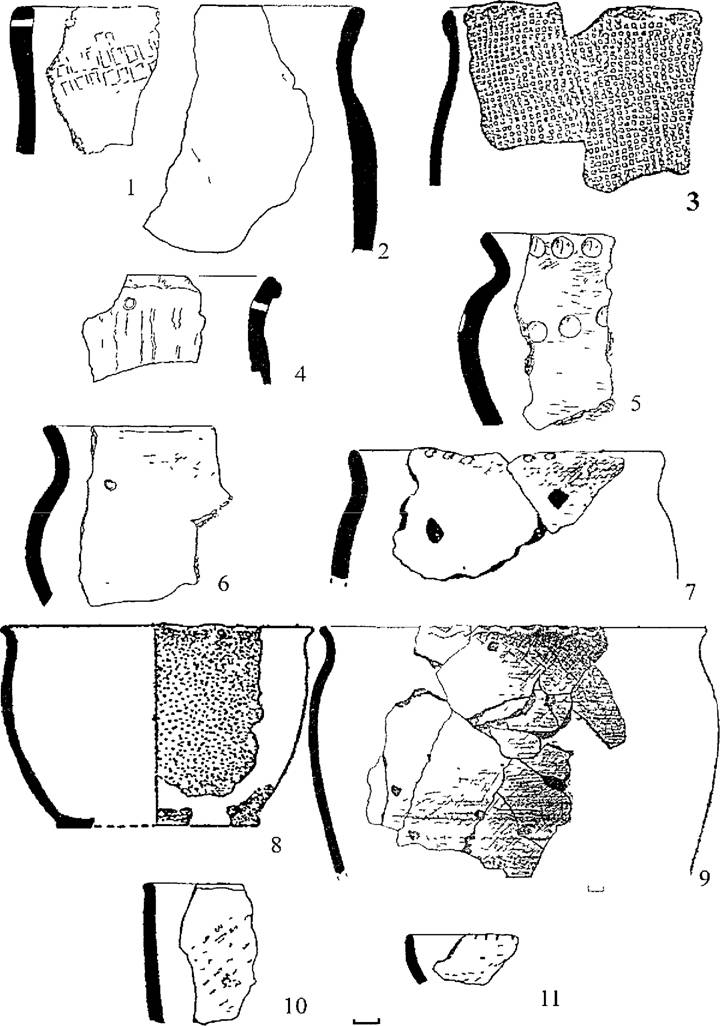 Рис. 37. Керамический комплекс поселения Замятино 10. 1-3 -горшки тип III, 4-6 - горшки тип IV, 7-8 - горшки тип VI, 9-11- банки.