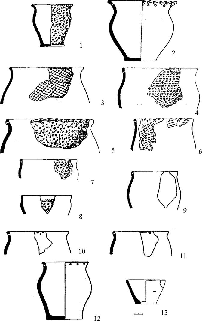 Рис. 34. Керамический комплекс поселения Студеновка 3. 1-2 - горшки тип I, 3-5 - горшки тип II, 6 - горшки тип III, 7-8 - горшки тип IV, 9 - горшки тип VII, 10- 12 - горшки тип VIII, 13 - чашки.