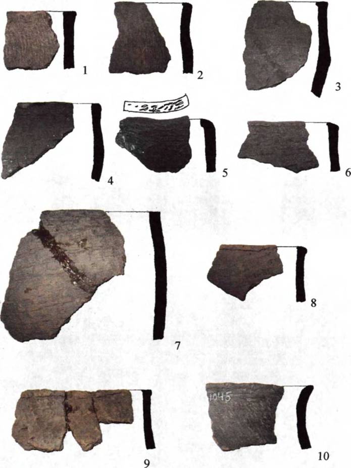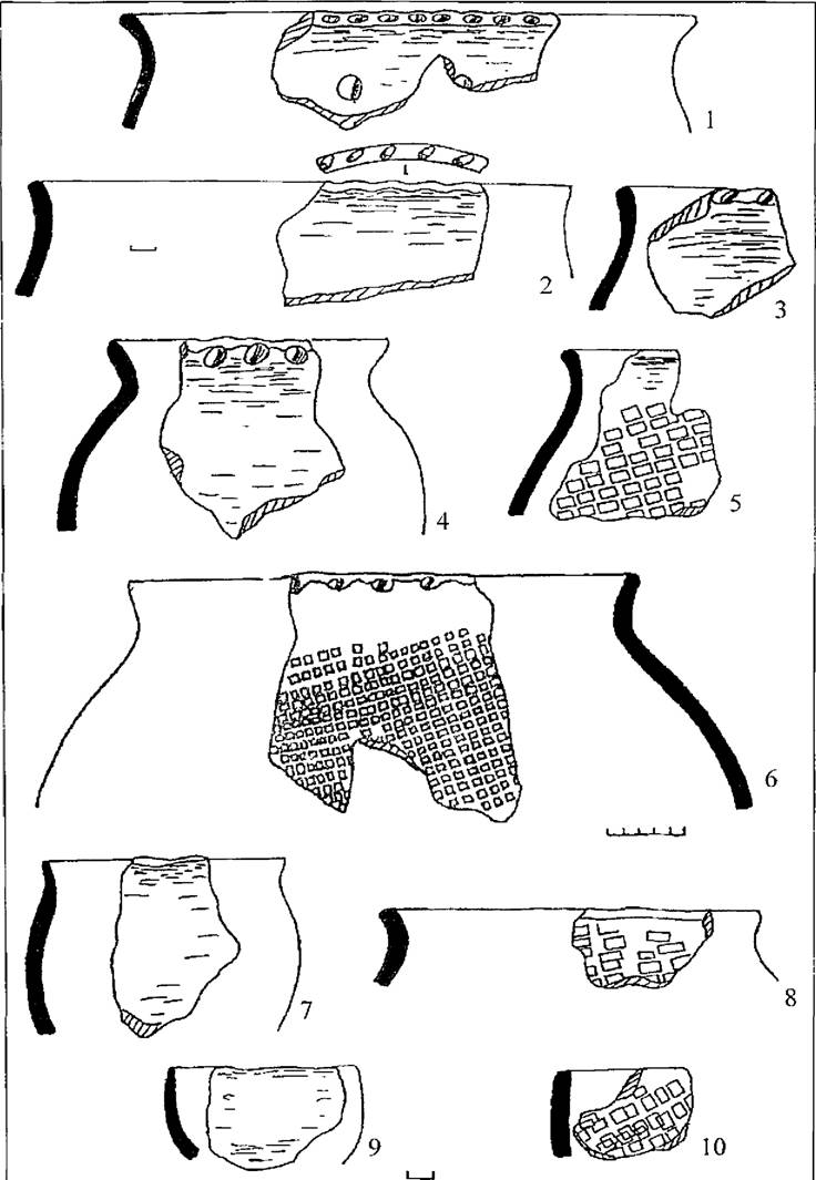 Рис. 48. Керамический комплекс Саратовского Поволжья. 1-7 - Танавское городище, 8-9 -Хвалынские городища, 10 - Чардымское 2 городище.