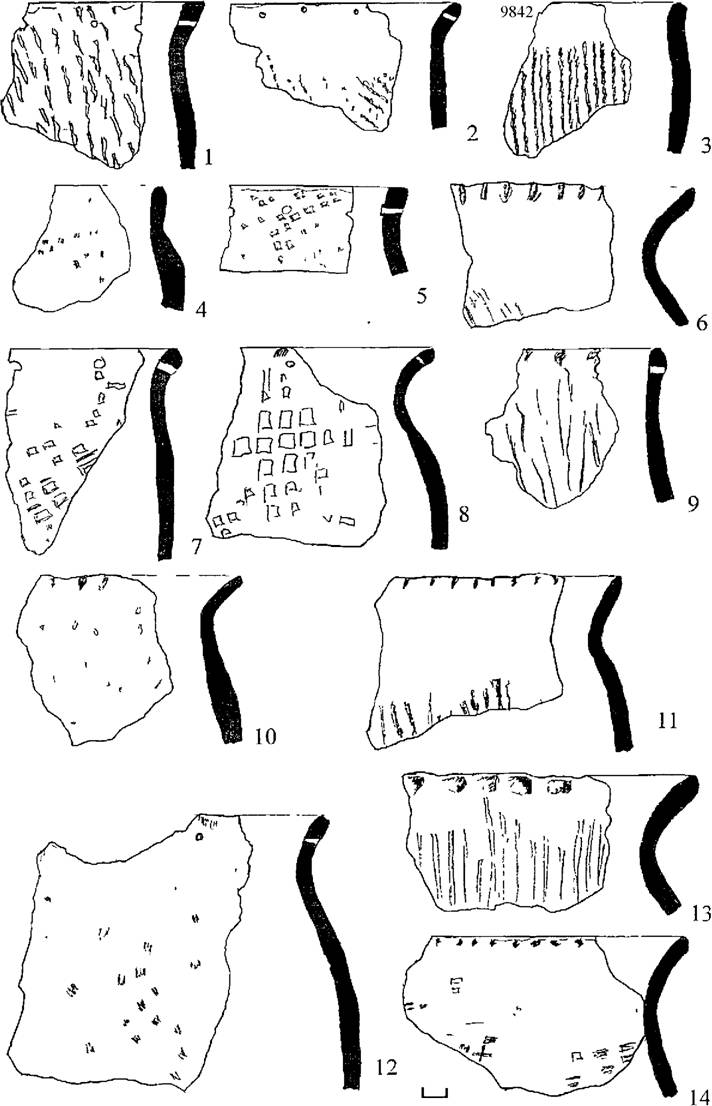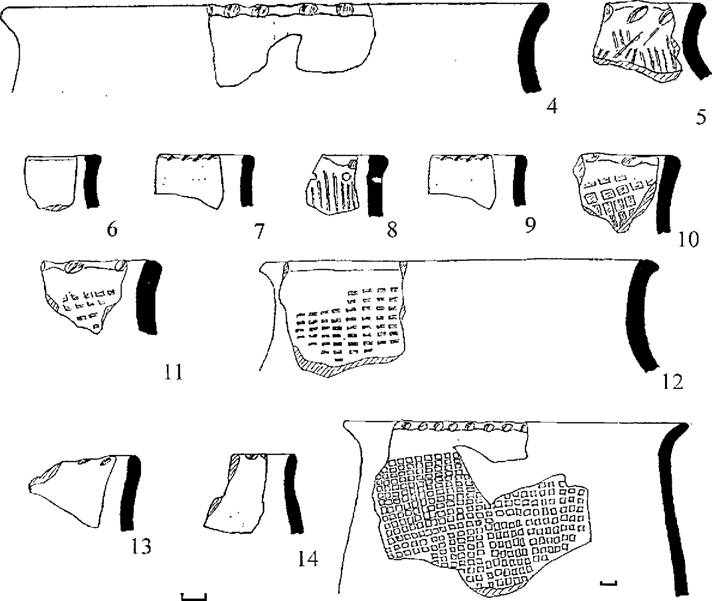 Рис. 36. Керамический комплекс поселения Замятино 5. 1-2 - горшки тип I, 3-5 - горшки тип II, 6-11 - горшки тип III, 12-15 - горшки тип IV.