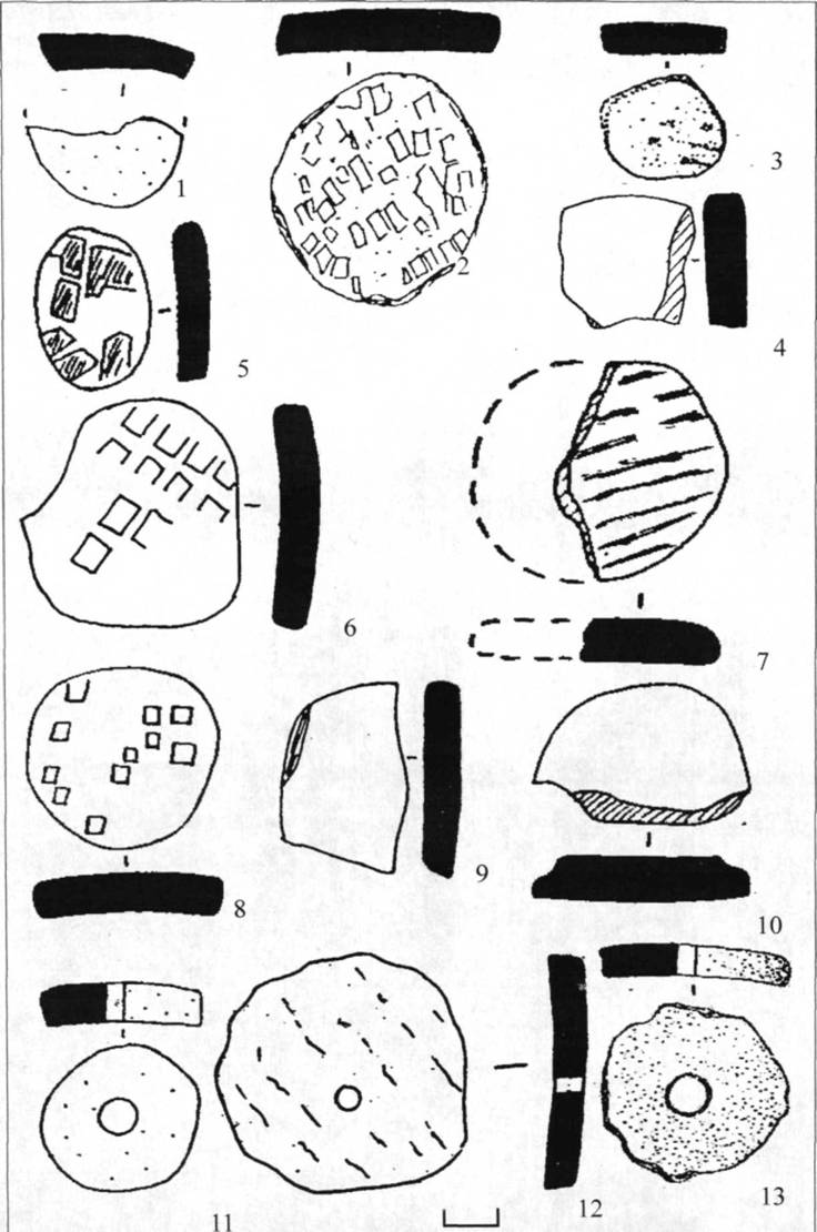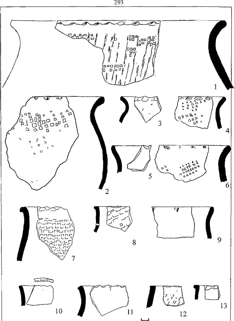 Рис. 39. Керамический комплекс поселения Ксизово 17. 1-3 горшки тип I, 4-6 - горшки тип II, 7-8 - горшки тип III, 9-11 - горшки тип IV, 12 - банка, 13 - чашка.