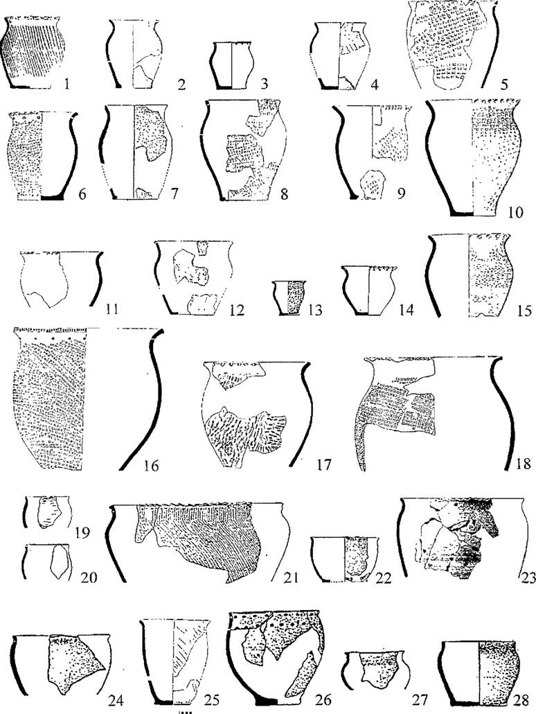 Рис. 41. Целые и приближенные к ним формы горшков. 1-10 - тип А, 11-18 - тип Б, 19-20 - тип В, 21-24 - тип Г, 25 - тип Д, 26 - тип Е, 27 - тип Ж, 28 - тип 3. 1,5 - Перехваль 2, 2 - Малый Липяг, 3,13-14,20 - Студеновка 3, 4,78,12,22-23- Дубики, 6,11 - Замятино 5, 9,25 - Александровка, 10,15-16 - Ксизово 17, 17-18 - Сырское, 19 -Курино 1, 21,24,26-28 - Пекшево.