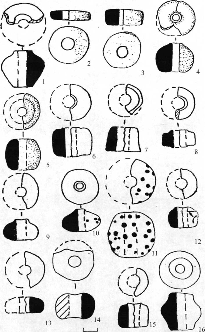 Рис. 52. Глиняные пряслица. 1 - Курино 1, 2-3 - Малый Липяг, 4-5 - Перехваль 2,6-16 - Сырское городище.