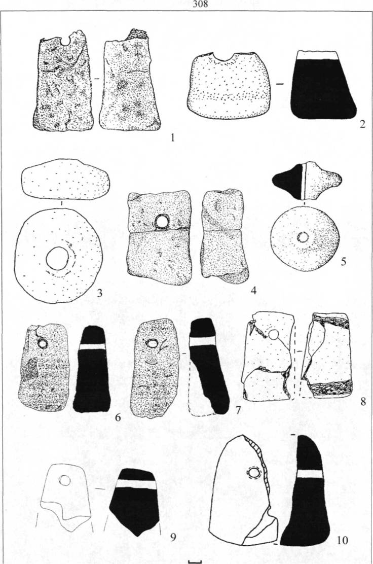 Рис. 54. Глиняные грузила. 1-2,4-5 - Малый Липяг, 3,8 Александровка, 6-7 - Дубики, 9 - Ксизово 17,10 - Курино 1.