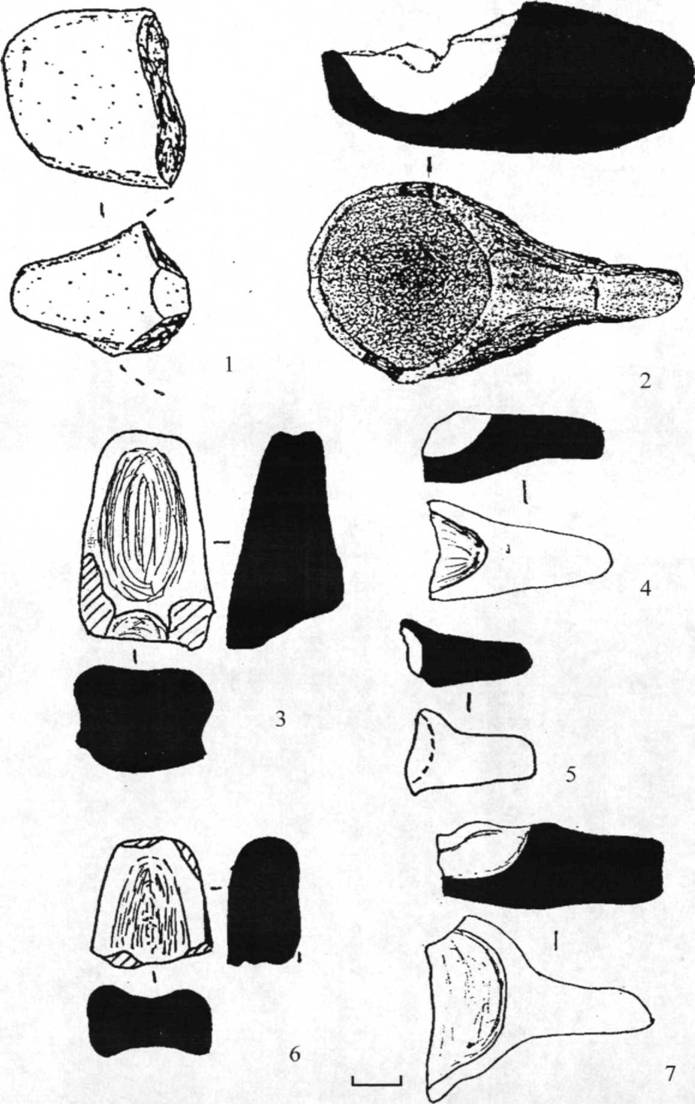 Рис. 56. Глиняные льячки. 1 - городище Александровка, 2 - Дубики, 3-7 - Сырское городище.