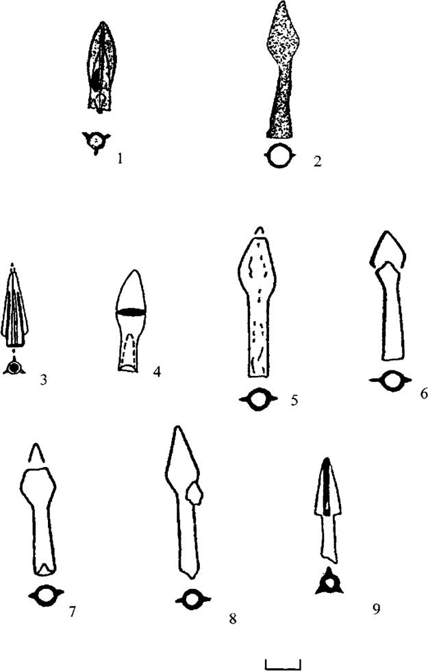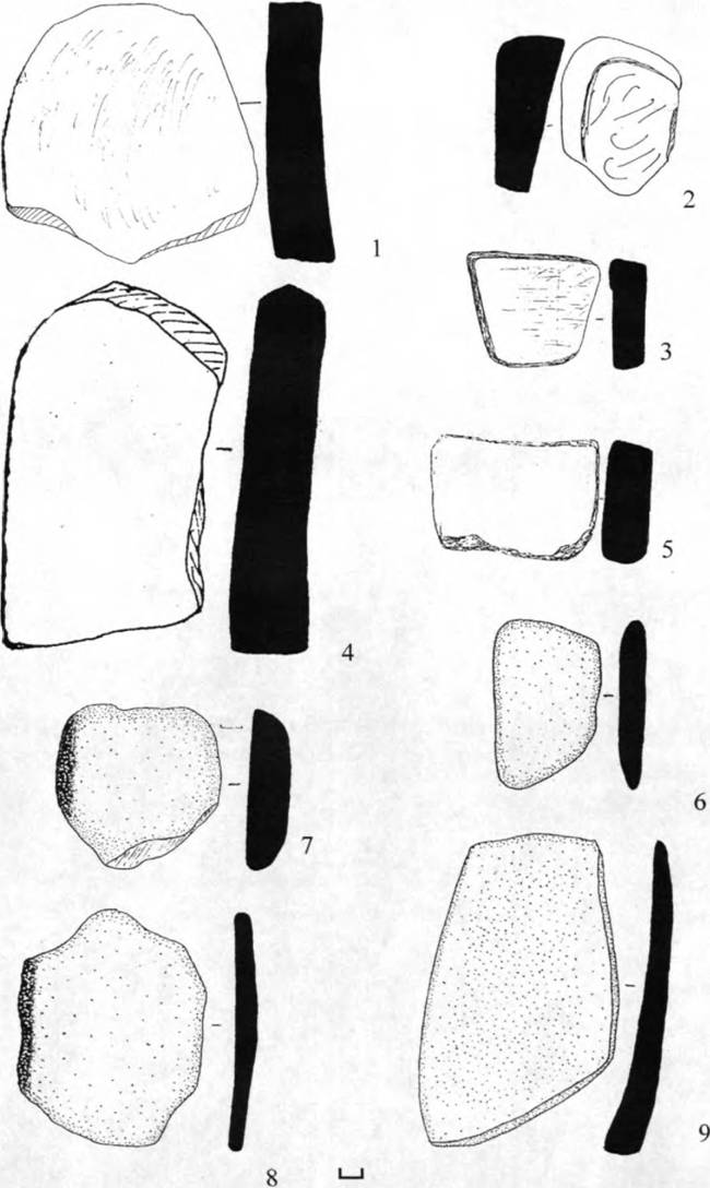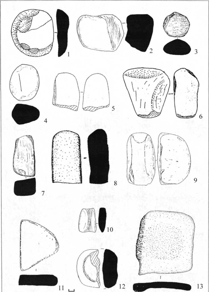 Рис. 57. Каменные изделия. 1-2,4 - Сырское городище, 3 - городище Александровское, 5 - Малый Липяг, 6-9 - Перехваль 2.