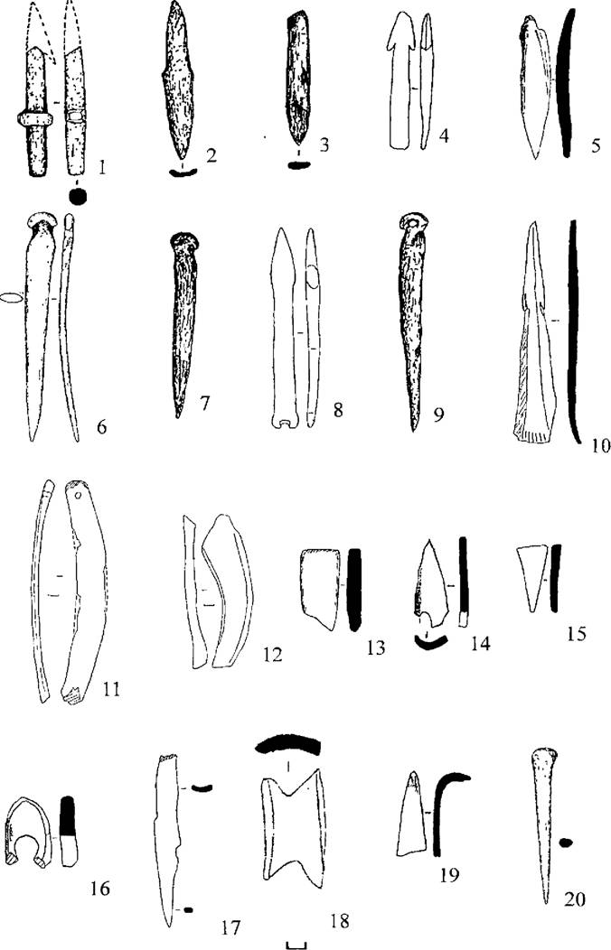 Рис. 61. Костяные изделия. 1-3,7,9 - Пекшево, 4,8,10-12,14-17,19 - Сырское городище, 5,13 - Перехваль 2, 6 - Воргол, 18 - Чертовиц кое 6, 20 - Ксизово 17.