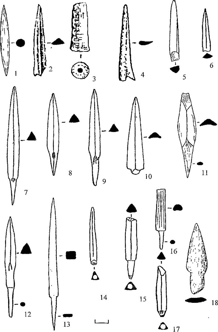 Рис. 62. Костяные наконечники стрел. 1 - Замятино 5, 2-4 - Пекшево, 5-17 - Сырское городище, 18 - Ксизово 17.