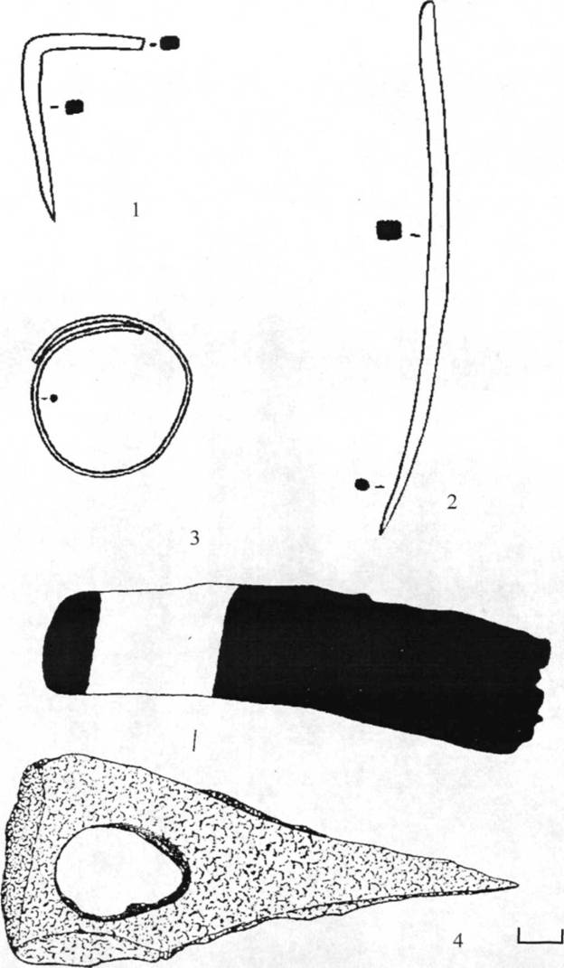 Рис. 64. Металлические изделия. 1-2 - Сырское городище, 3 - Воргол, 4 - Дубики. 1-2,4 - железо 3 - бронза.,