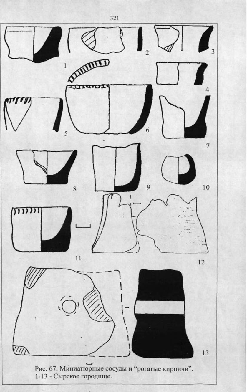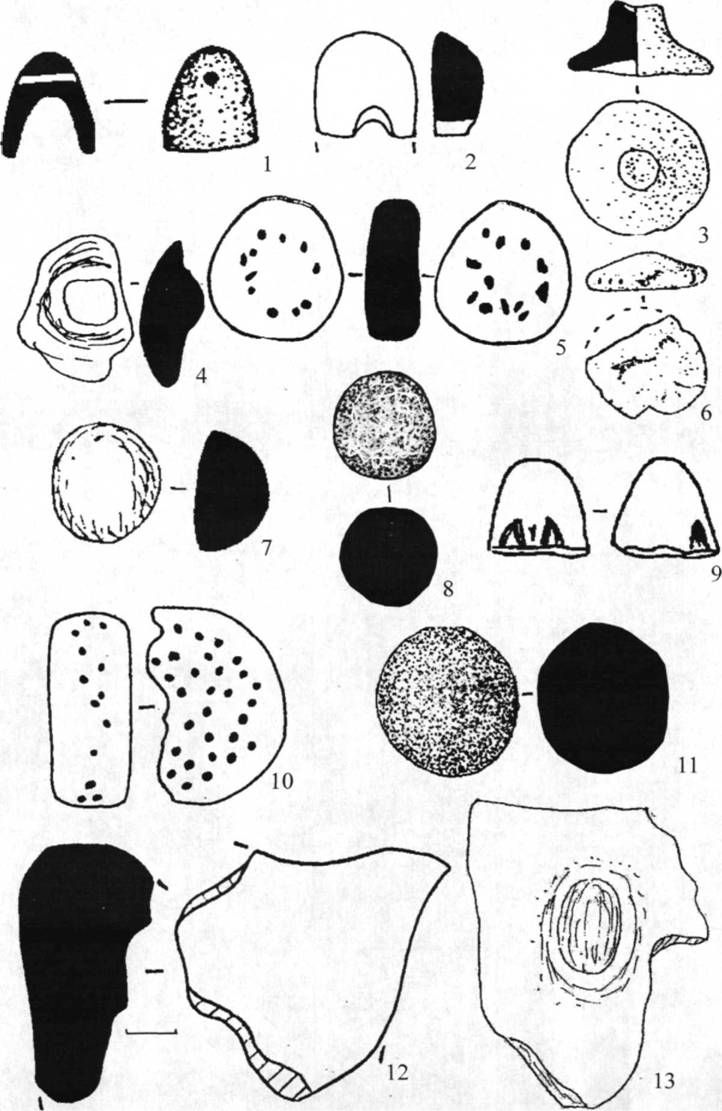 Рис. 65. Глиняные изделия. 1 - Пекшево, 2,4-5,7,10,12-13 - Сырское городище, 3 - городище Александровка, 6 - Малый Липяг, 8,11 -Дубики, 9 - Курино 1.