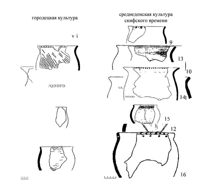 Рис.69. Керамика городецкой и среднедонской скифского времени культур. 12,4,6 - Сырское городище, 3 - Перехваль 2,5 - Дубики, 7 - Студеновка 3,8 - Курино 1,9- городище Каменка, 10-11 - Русская тростянка городище, 12,15 - Мостище горопище. 13. 14 - Частые курганы поселение 3. 16 -Пекшево.