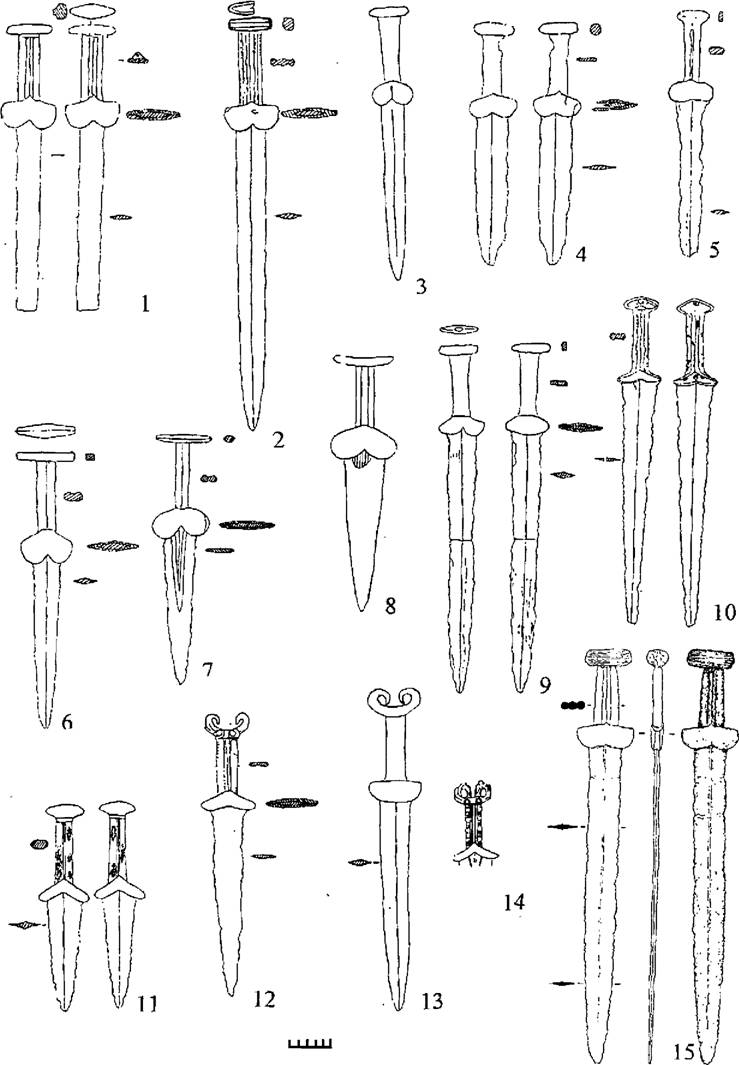 Рис. 72. Мечи скифского типа, обнаруженные на Верхнем Дону. 1 - Чаплыгин, 2 - Спасское-Чириково, 3 - Сергиевка, 4 - Воронежская обл., 5 - Вторые Тербуны, 6 - Стрелецкая, 7 - Черниговка, 8 - Воронежская обл., 9 - Липецк, 10 - Липецкий р-н, 11 - Капитанщино, 12 -Добринский р-н, 13 - Вторые Тербуны, 14 - Елецкий р-н, 15 - Никольское.