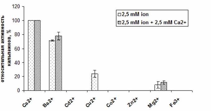 Рис. 1. Относительная активность кальпаинов мягкого тела мидии Mytilus edulis L. в присутствии различных катионов