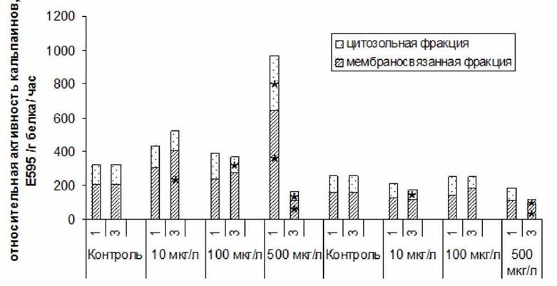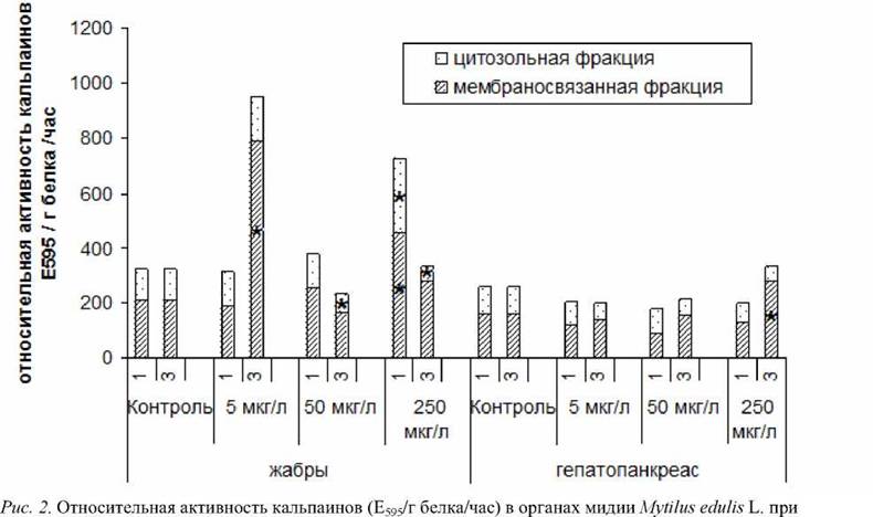 Наряду с этим было установлено, что в гепатопанкреасе мидий уровень активности кальпаи- нов не изменялся при суточном воздействии меди и кадмия всех изученных концентраций; лишь через трое суток наблюдались достоверные отличия Са2+-зависимой активности в данном органе. Вероятно, это можно объяснить тем, что к этому времени может начинаться отток металлов от уязвимых тканей (жабры) к тканям, функционально задействованным в детоксикации, аккумуляции и экскреции ксенобиотиков (гепатопанкреас и почки).