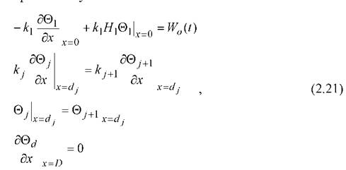 где aj- коэффициент температуропроводности /-того слоя, dj- координата начальной границы j-того слоя, dj+ι- координата конечной границы. Распределение температуры в слоях находится из решения системы уравнений с учетом следующих граничных условий: