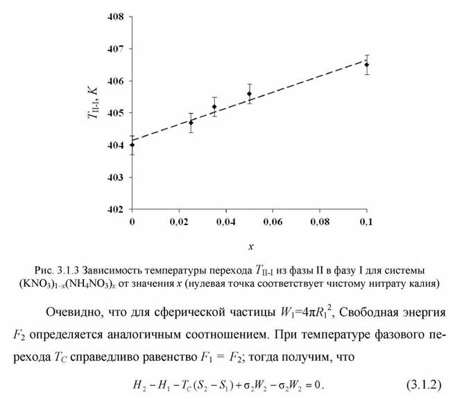 К сожалению, мы не располагаем достаточным количеством экспериментальных данных, относящихся к поверхностному натяжению для нитрата калия и поликристаллических бинарных композитов (KNO3)ι.x(NH4NO3)x (х = 0.025, 0.035, 0.050, 0.100). Тем не менее, в рамках разработанной модели [172] можно заключить, что поверхностное натяжение в фазе I для бинарных смесей меньше, чем в фазе II, а также, что разница между поверхностным натяжением в фазах I и II растет с увеличением значения х. Следует отметить, что соотношение, подобное (3.1.3), можно получить также для сдвига температуры плавления небольших сферических частиц (см, например, работу [172]).