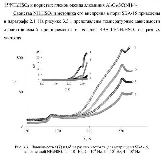 Пунктиром указаны температурные границы фаз в тиомочевине. На вставке показана зависимость γ3ω(Γ) для монокристалла SC(NH2)2В отличие от объемного SC(NH2) для нанокомпозитов наблюдается значительная частотная зависимость диэлектрических свойств и сдвиг температур фазовых переходов относительно объемного SC(NH2)2. В качестве примера, иллюстрирующего частотную зависимость, на рисунке 3.4.5 приведены зависимости ε'( Г) и tgδ(7) для нанокомпозитного образца с размерами пор 60 нм. На рисунке 3.3.6 показаны температурные зависимости действительной части диэлектрической проницаемости ε'( Т) образцов поликристал- лического SC(NH2)2и эффективные диэлектрические проницаемости нано- композитных образцов с диаметрами пор 100 и 60 нм, измеренные на часто-