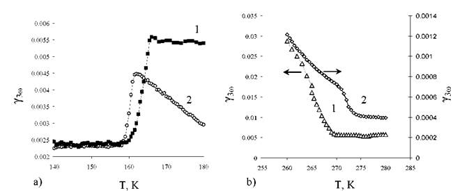 Температурное исследование коэффициента третьей гармоники 3ω подтверждает уменьшение температуры фазового перехода T2примерно на 7 К (рис.3.3.3 а). Однако зависимостьу 3ωот температуры показывает, что высокотемпературный переход увеличивается на 4 К (рис.3.3.3 b) . В данном случае метод нелинейной диэлектрической спектроскопии позволяет диагностировать сдвиг температуры верхнего фазового перехода, который не был обнаружен по результатам диэлектрических исследований.