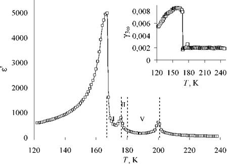 сегнетоэлектрической фазы I в фазу II, наблюдается при температуре Tc ≈ 169 К. Более слабый рост диэлектрической проницаемости виден вблизи температуры Tiфазового перехода между несоразмерной структурой IV и парафазой V. Пик диэлектрической проницаемости в интервале промежуточных температур соответствует появлению сегнетоэлектрической фазы III.