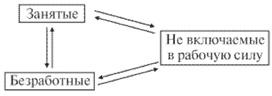 Показатели изменения количества занятых и безработных, численности рабочей силы и численности не включаемых в рабочую силу являются показателями потоков (рис. 5.1). Между категориями занятых, безработных и не включаемых в рабочую силу постоянно происходят перемещения.