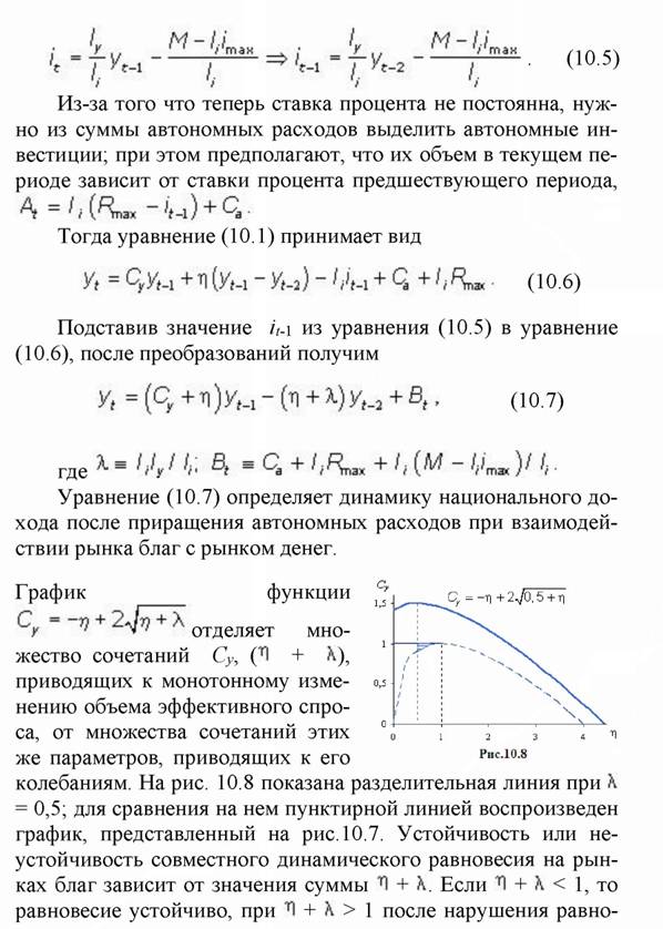 не имеют эк. смысла. Как следует из рис. 10.8, с включением в модель рынка денег область устойчивого равновесия сокращается на заштрихованную площадь; это уменьшение тем больше, чем выше А.