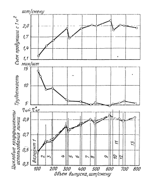 Из рис. 1.7 видно, что исходный вариант линии не рационален: цикловой коэффициент использования оборудования менее 50%, сменный объем выпуска менее 100 шт., трудоемкость обработки детали около 14 нормо-мин. Лимитирующей операцией является операция У, она задает такт линии, равный 4,7 мин. Поэтому согласно описанному выше алгоритму добавляем еще один станок на операции У, получаем вариант 2. В варианте 2 лимитирующей становится операция 2 с тактом 3 мин. Переход к варианту 2 обеспечивает улучшение всех показателей: использование оборудования повышается до 60%, а сменный выпуск — до 153 шт., трудоемкость снижается до 9 нормо-мин/шт. Вариант 3 планировки линии получен добавлением одного станка на операции 2. Затем постепенным добавлением по одному станку на обнаруживаемых лимитирующих операциях получены варианты 4—6 и т. д. Всего было составлено 13 вариантов. На рис. 1.7 показано изменение основных показателей: коэффициентов использования Ццл и 'Пдл* трудоемкости и съема продукции с 1 м2 площади в смену.