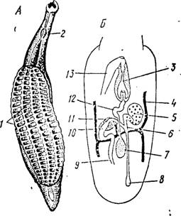 Представители Aspidogastraea (рис. 145, А) паразитируют в моллюсках (в основном — пластинчатожаберных) и в водных позвоночных (рыбы и черепахи). По большей части это мелкие черви, 3—5 мм длиной. На переднем конце их тела располагается ротовое отверстие, окаймленное мускульным валиком. Оно ведет в неразветвленный мешковидный кишечник. Выделительная система аснндогастрид устроена по протопефрпдпальному типу; нервная — носит' характер ортогопа. Гермафродитная половая система (рис. 145, Б) мало чем отличается от таковой других плоских червей.