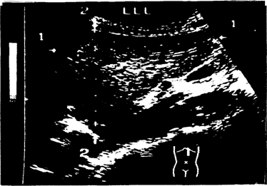 | Рис. 6. Изображение левой доли печени при измерении кранио-каудального размера и толщины левой доли в положении продольного сканирования вдоль левой парастернальной линии при вертикальном расположении датчика. Стрелками и маркерами отмечены оси измерения: 1-1 –кранио-каудальный размер, 2-2 – толщина левой доли |