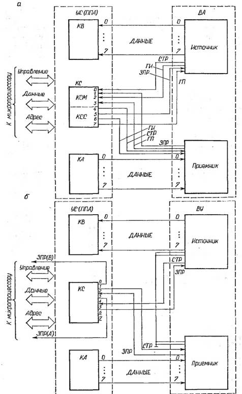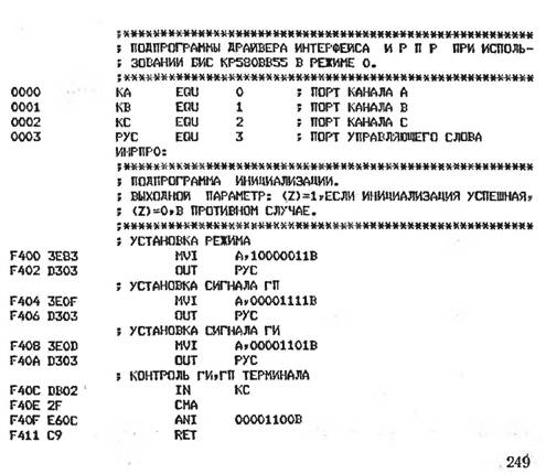Программа ВЫБ управляет выводом байта в накопитель. Байт загружается в порт ПВЫ, после чего генерируется сигнал «Пуск» путем выполнения команды OUT ПУСК- Возврат из программы выполняется только при наличии сигналов «Завершено» или «Запрос передачи». Программа ВВБ производит ввод байта из накопителя. Сначала выдается сигнал «Пуск», а затем происходит ожидание сигналов «Завершено» или «Запрос передачи». Для организации этого ожидания с помощью команды CALL вызывается соответствующий фрагмент подпрограммы ВЫБ. Затем из порта ПВВ вводится байт. Программа вывода команды (ВЫКОМ) обеспечивает установку в заданной команде бита номера устройства в соответствии с содержимым ячейки NYCT.