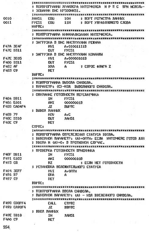 В программе ВВДСК, которая выполняет чтение содержимого сектора в память, сначала с помощью подпрограммы ВВСЕК информация из сектора считывается в буфер накопителя, а затем посредством подпрограммы ВВБУФ — в память МП системы. Если хотя бы одна из этих подпрограмм возвращает в вызывающую программу отрицательный статус своего завершения, описанная процедура повторяется до 32 раз. Если все попытки оказываются неудачными, программа ВВДСК устанавливает отрицательный статус своего завершения. Запись информации из памяти МП системы в сектор на диске реализует подпрограмма ВЫДСК- В этой программе с помощью подпрограмм ВЫБУФ и ВЫСЕК информация записывается сначала в буфер накопителя, а затем на диск. Так же как и в программе ВВДСК, предусмотрен 32-кратный повтор в случае получения От вызываемых подпрограмм отрицательного статуса их завершения.