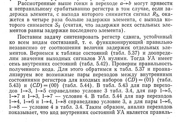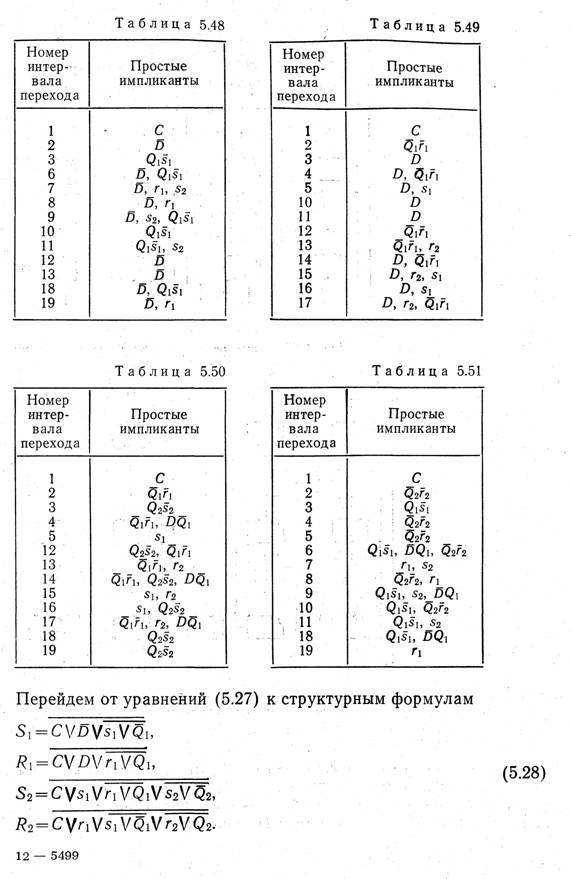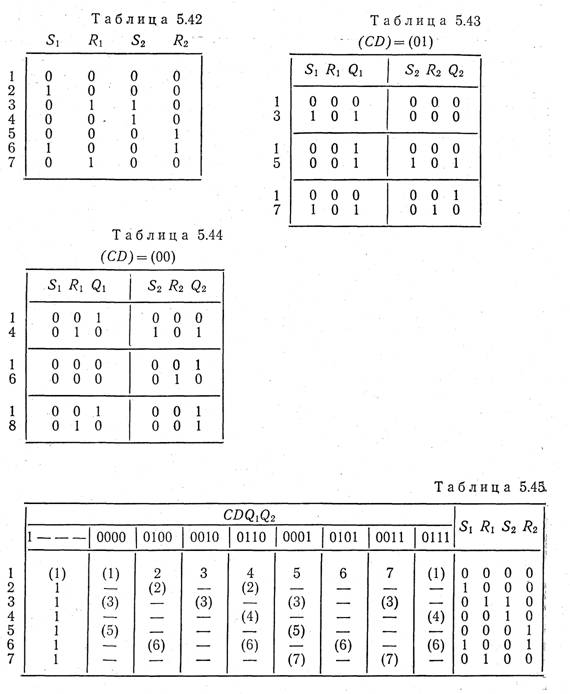 ным. Построим таблицу переходов УА (табл. 5.45) и проверим анализ последствий возможных неодновременных изменений сигналов Si, Ru S2, R2 (аналогично тому, как это делалось прц синтезе реверсивного счетчика). Анализ свидетельствует о необходимости преобразования табл. 5.45 в табл. 5.46. По табл. 5.46 составим структурную таблицу УА (табл. 5.47). Найдем из табл. 5.47 простые импликанты, покрывающие нулевые интер--