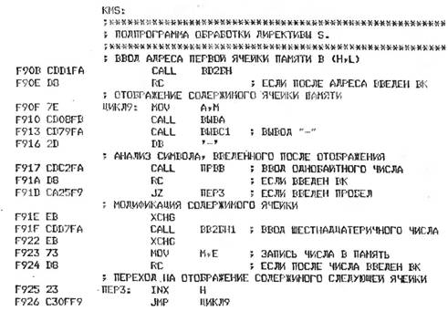 Модель памяти (М) представляет собой упорядоченную и пронумерованную последовательность 8-разрядных структурных элементов — ячеек памяти, или внешних регистров. 8-разрядное двоичное слово, хранимое в ячейке памяти (регистре), называется байтом, а отдельный двоичный разряд слова — битом. Номер ячейки памяти является ее адресом. 16-разрядная шина адреса МП позволяет обращаться к адресному пространству (максимальной совокупности адресуемых ячеек памяти) размером 216 = 65536 = 64 К байт (К = 1024 — общепринятая константа). Для нумерации адресов памяти используется шестнадцатеричная система счисления с цифрами 0, 1, ..., 9, А, В, С, D, Е, F. Каждый байт может быть представлен двумя полубайтами (старшей и младшей тетрадами бит), значения которых однозначно кодируются указанными шестнадцатеричными цифрами. При этом адрес любой ячейки памяти представляется 4-разрядным, а ее содержимое —