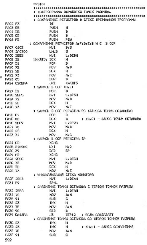 Таким образом, команды рестарта — это аппаратные аналоги команд вызова подпрограмм, инициализируемые сигналом прерывания в любой точке и в любой момент времени выполняемой программы. При таком неожиданном вызове подпрограммы необходимо обеспечить сохранение в стеке слова состояния процессора и содержимого РОН для возобновления после обслуживания прерывания нормального хода прерванной программы. Заметим, что модификации МП КР580 с индексом А обладают возможностью отработки в режиме прерывания не только команд рестарта, но любой последовательности команд, аппаратно формируемой в этом режиме контроллером прерываний. В частности, они воспринимают аппаратно формируемую трехбайтную команду CALL В2ВЗ, что позволяет осуществлять вызов подпрограммы из любой области памяти.