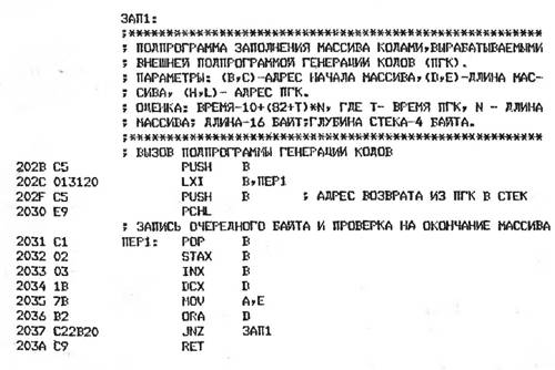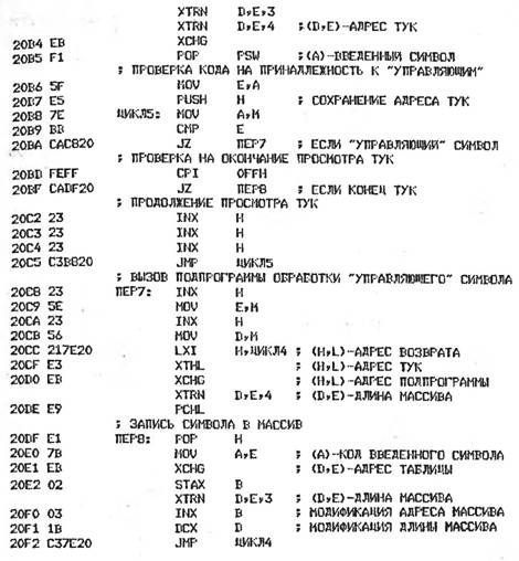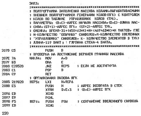 Если при очередном сравнении флаг Z равен нулю, т. е. байты не равны, выполнение цикла прекращается. В конце итерации модифицируются указатели массивов и счетчик текущей длины. Значение выходного параметра записывается в регистр (А) в теле цикла непосредственно перед командами условного перехода с помощью команды МѴІ, которая не изменяет состояние флагов микропроцессора. Этот прием позволяет достигнуть большей компактности программы, но увеличивает время ее выполнения.В программе предусмотрено сохранение значений входных параметров. В некоторых случаях при выполнении операции сравнения необходимо не только знать факт неравенства массивов, но и установить адреса байтов, по которым произошло несовпадение. Это можно обеспечить, если убрать из текста программы команды записи в стек и команды восстановления из стека, а также команду возврата, причем команды условного перехода, обеспечивающие выход из цикла, заменить командами условного возврата. Тогда в-случае несовпадения массивов наряду с признаком в регистре (А) в регистровые пары (D, Е) и (Н, L) будут возвращены адреса несовпадающих байтов соответственно первого и второго массивов. Если необходимо обеспечить обработку несовпадающих байтов с помощью внешней подпрограммы, например для индикации их адресов и значений, следует команду условного перехода заменить командой условного вызова CNZ подпрограммы обработки.