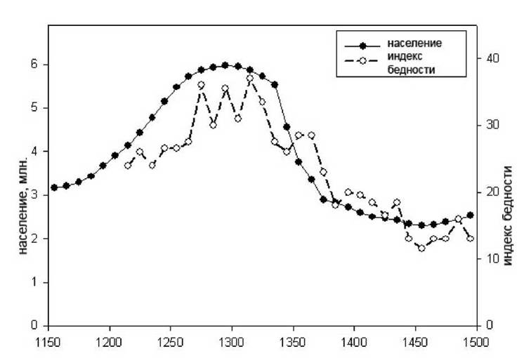 Рисунок 2.1. Численность населения и «индекс бедности» в Англии в 1150-1500 гг. Данные о населении (Hatcher 1977; Hatcher и Bailey 2001), модифицированы, чтобы, согласно Халламу (Hallam 1988b:537) показать замедление темпов роста в течение XII в. Индекс бедности - величина, обратная к реальной заработной плате; она определяется как число дней работы, необходимое, чтобы купить стандартную корзину предметов потребления (по данным AHEW II:778 и AHEW III:491).