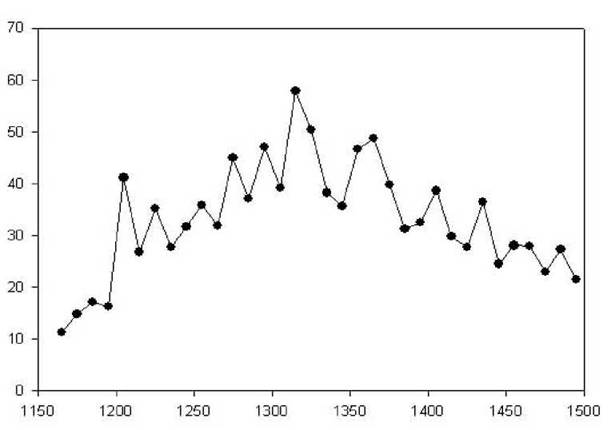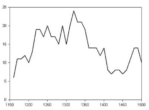 Рисунок 2.5. Число главных строительных объектов в динамике за каждое десятилетие с 1150 до 1500 г. ( Morris 1979: fig. 7).