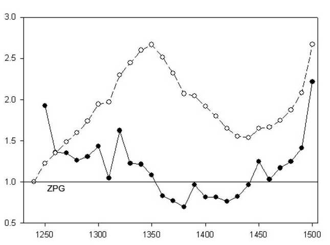 Рисунок 2.4. Численная динамика земельной элиты. Сплошная линия: коэффициент замещения рассчитывается по данным посмертных расследований. Пунктирная линия: относительная численная динамика рассчитывается через коэффициент замещения, предполагая, что время поколения равно 32 годам. «ZPG линия»: нулевой прирост населения, когда коэффициент замещения равен единице (Hollingsworth 1969).