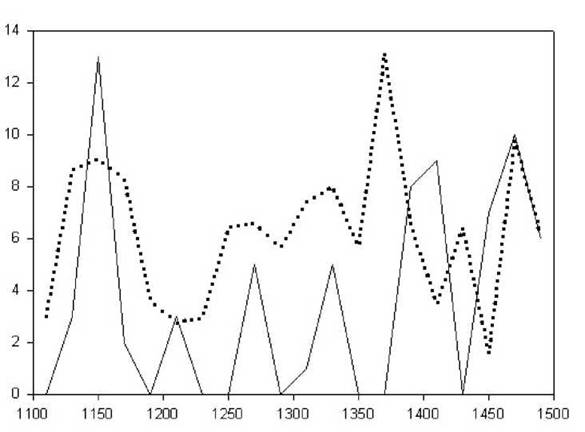 Рисунок 2.7. Социально-политическая нестабильность в Англии в 11001500 гг. Сплошная линия - частота восстаний и гражданских войн за 20 лет; пунктирная линия - количество кладов за 20 лет. Индекс нестабильности рассчитан на основе данных табл. 2.5, данные монетных кладов см.: Thompson 1956.
