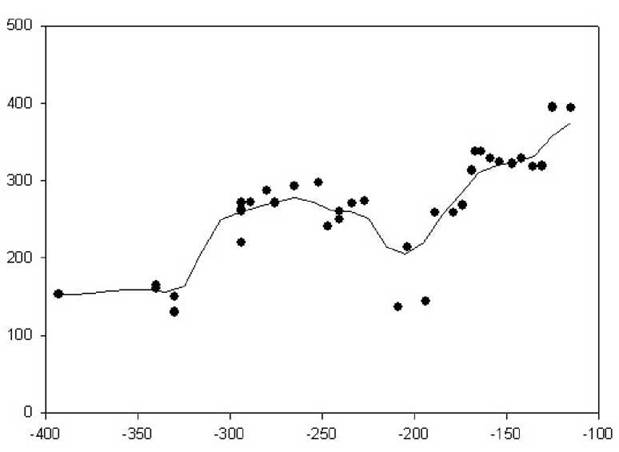 Рисунок 6.3. Численность римских граждан в 400-100 гг. до н.э., тыс. Данные переписей и сглаживающая кривая. (Toynbee 1965:438-439).