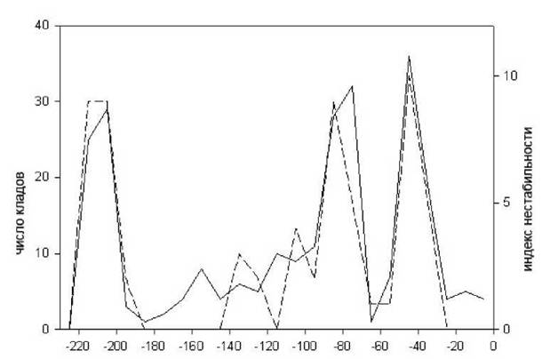 Рисунок 6.5. Социополитическая нестабильность в полуостровной Италии (включая Сицилию) в 220-0 гг. до н.э. измерена двумя индексами: (1) количество монетных кладов в десятилетие (сплошная линия) и (2) число лет внутренней войны в десятилетие (пунктирная линия). Данные о кладах см.: Crawford 1993:162. Индекс внутренней войны подсчитан по табл. 6.2 (добавлена война с Ганнибалом в 218-201 гг. до н.э.).