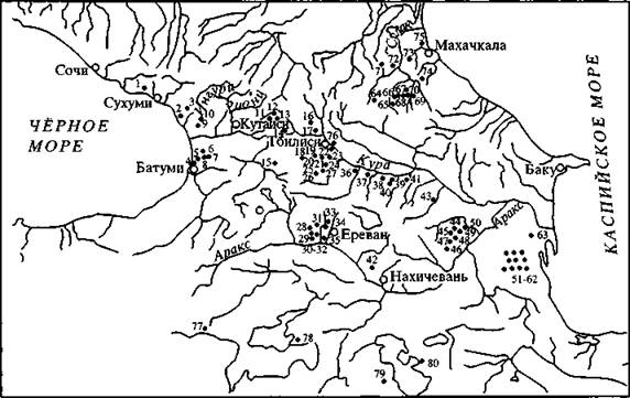 46- Aragats, 47- Kosi-Choter, 48 -Takavoranist, 49 -Leninakan (Ghyumri), 50- Amiranis-Gora, 51- Idjevan district, 52 - Shaglama П, Ш, 53 - Shamhor district, 54 - Shulaveris-Gora, 55 - Imiris-Gora, 56 - Tetri-Tskaro, 57 - Samshvilde, 58 - Kiketi, 59 - Tamarisi, 60 - Trialeti district, 61 - region of the sity of Tbilisi, 62 - Mtskheta district, 63 - Tkviavi, 64 - Berikldeebe, 65-67 - Urbnisi, Khizanaant-Gora, and Kvatskhelebi, 68 - Gudaberdka (Tsihia-Gora, 69 - Zgudris-Gverda, 70 - Narats-Gora, 71 - Kulbakebi, 72 - Sachkheri, 73 - Tsamis-Gora, 74 - Koreti, 75 - Gremi, 76 - Ilto, 77 - Sioni, 78 - Mashnaari, 79 - Borispol-Tepe, 80 - Ghyaldo-Tepeleri, 81 - Ghevdishan-Tepe, 82 - Ghilyar, 83 - Sharakun, 84 - Derbent, 85 - Velikent, 86 - Mamaikutan, 87 - Kaiakent (Ghemi-Tyube І-П), 88 - Mekeghi, 89 - Mahachkala, 90 - Chirkei, 91 - Galgalatli, 92 - Sheboh, 93 - Ghinchi, 94 - Chinna, 95 - Serjen'yurt 1-П, 96 - Lugovoe, 97 - Shauleghet; a - settlement, 6 - burial mounds, в- ground graves