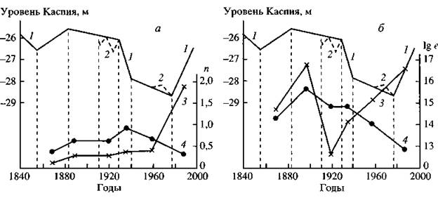 Fig. 182. Correlation of, stages of the Caspian level changes with number of earthquakes with Ms>4,9 (a) and average annual seismic energy, released during these stages (б) [Иванова, Трифонов, 2002]