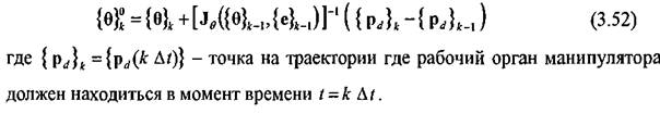 Определив упругие перемещения из уравнения (3.49) вычислим ошибку в положении рабочего органа из уравнения (3.36). Новые значения присоединенных углов в сочленениях, компенсирующие эту ошибку вычисляются по формуле
