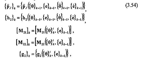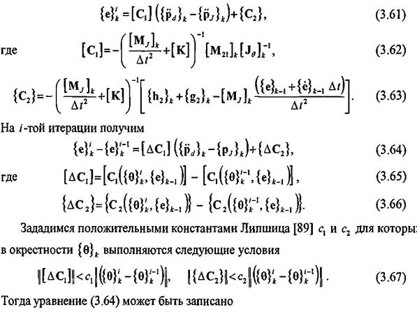 силы инерции в (3.37) можно считать нестационарным возмущающим воздействием для быстрой упругой подсистемы. Тогда общая итерационная схема интегрирования строится следующим образом: значения вектора упругих перемещений {e} и его производных вычисляются из уравнения динамического равновесия (3.37), а значения вектора присоединенных углов в сочленениях
