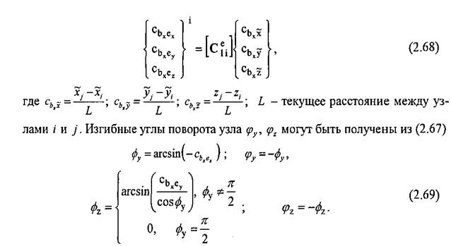 Для нахождения изгибных углов поворота узлов по принципу 1 необходимо решение обратной кинематической задачи, в которой известными являются направляющие косинусы оси bxлокальной CK СКЭ. Матрица ортогонального вращения на искомые углы ортов ex, ey, ez CK поперечного сечения определяется выражением (2.67). Первая строка матрицы в (2.67) содержит направляющие косинусы оси bxв системе координат заданной осями ex, ev, ez.