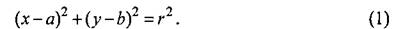 Используя данную идею выберем случайно четыре контурных пикселя из множества V. При этом выбранные пиксели удаляются из К и помещаются во временное множество пикселей окружности Vcir.Выясним, лежат ли выбранные пиксели на одной окружности. Три из четырех пикселей (которые назовем опорные пиксели) используются для вычисления параметров возможной окружности - координат центра и радиуса {a,b,r). Для оставшегося пикселя проверяем условие - находится ли он на окружности с вычисленными параметрами.