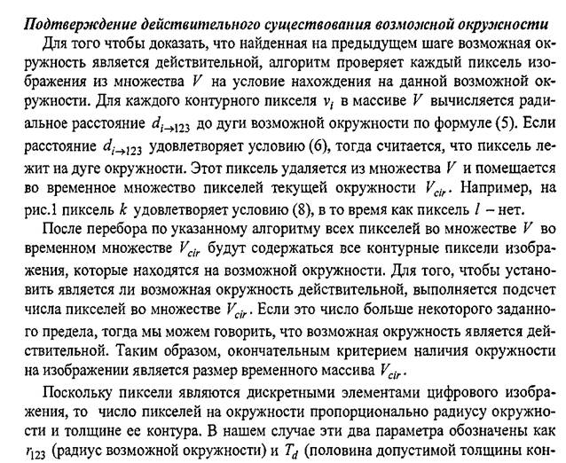тура). В общем случае число пикселей в окружности будет пропорционально величине 4τrri237j. Для контура малой толщины (Td= 0,5...0,7), число пикселей окружности на изображении будет пропорционально только ее радиусу, а именно: 2τrr123. Для того, чтобы алгоритм мог обнаружить неполные окружности (перекрытые другими объектами) и прерывистые окружности, составленные из участков дуги, число пикселей в окружности может быть меньшим, чем 2tγλj23∙Таким образом, возможная окружность является действительной, если для множества ее пикселей выполняется следующее условие.