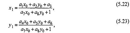 координаты соответствующей точки в текущем изображении; а - вектор коэффициентов преобразования. Выражения (5.22)-(5.23) учитывают как аффинные, так и проективные преобразования. В случае аффинных преобразований коэффициенты a-1и а& в знаменателе приравниваются нулю и выражения (5.22)-(5.23) становятся линейными.