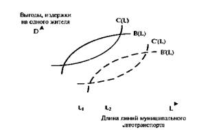 Рассмотрим пример. Предположим, что при проектировании и расширении города решается вопрос об оптимальной длине линий муниципального общественного транспорта На рис 7 2 показана зависимость выгод B(L) и издержек C(L) для отдельного среднего жителя от получения услуг автотранспорта в зависимости от длины L линий городского муниципального автотранспорта По вертикали Д обозначают доходы и затраты Оптимум достигается в такой точке L(, в которой разница между выгодами и издержками достигает максимума