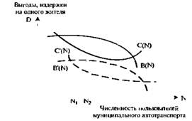 Решение этой задачи изображено на рис. 7.3. Оптимальная численность пользователей N( выявляется в такой точке, в которой превышение выгод над издержками в расчете на одного жителя достигает максимума При иной влине городских линий автотранспорта, например обозначенной L2, оптимум достигается в другой точке — N2